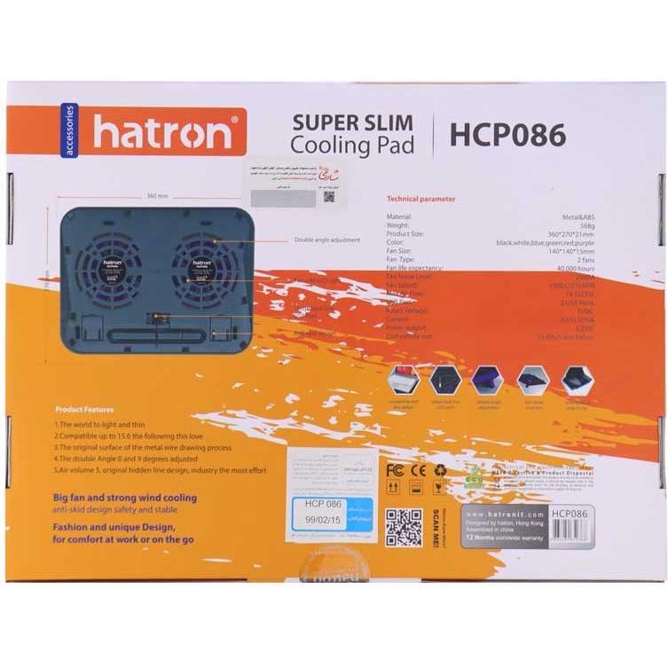 «هترون» (Hatron) یکی از تولیدکنندگان پیشرو در زمینه تولید لوازم جانبی کامپیوتر مانند پاور، فن و پایه خنککننده است. محصولات این شرکت، گستره وسیعی از تولیدات خنککننده را شامل میشود و معمولاٌ از کیفیت مطلوبی برخوردار هستند. پایه خنککننده مدل «HCP086» نیز از طراحی زیبا و کیفیت ساخت رضایتبخشی برخوردار است. با توجه به ابعاد HCP086 میتوانید از این محصول برای لپتاپهایی 15.6اینچی و کوچکتر استفاده کنید. استند HCP086 با داشتن دو فن 140 میلیمتری قدرتمند، میتواند نقش مؤثری را در کاهش دمای لپتاپ ایفا کند. این محصول شرکت هترون از ترکیب فلز و پلاستیک ABS ساخته شده است و به همین دلیل از دوام و طول عمر بالایی برخوردار است. در قسمت زیرین این محصول محفظهای وجود دارد که کابل اتصال USB را در خود نگه میدارد. وجود این محفظه باعث میشود که کابل اتصال گم نشود و از گره خوردن و درهم پیچیدن کابل نیز جلوگیری میکند. این کابل از یک طرف به پایه خنککننده متصل است و در طرف دیگر دارای دو پورت USB متصل به یکدیگر است که یکی از آنها به لپتاپ وصل میشود و میتوانید از دیگری بهعنوان خروجی USB برای شارژ تلفنهمراه یا تبلت استفاده کنید. هترون دو پایه برای این محصول در نظر گرفته است که میتوانید با بازکردن آنها، یک سطح شیبدار را ایجاد کنید. البته میتوانید پایههای این استند را باز نکنید که با توجه به وجود لایههای باریک سیلیکونی در زیر این خنککننده، استفاده از آن روی میز خطوخشی ایجاد نمیکند.
