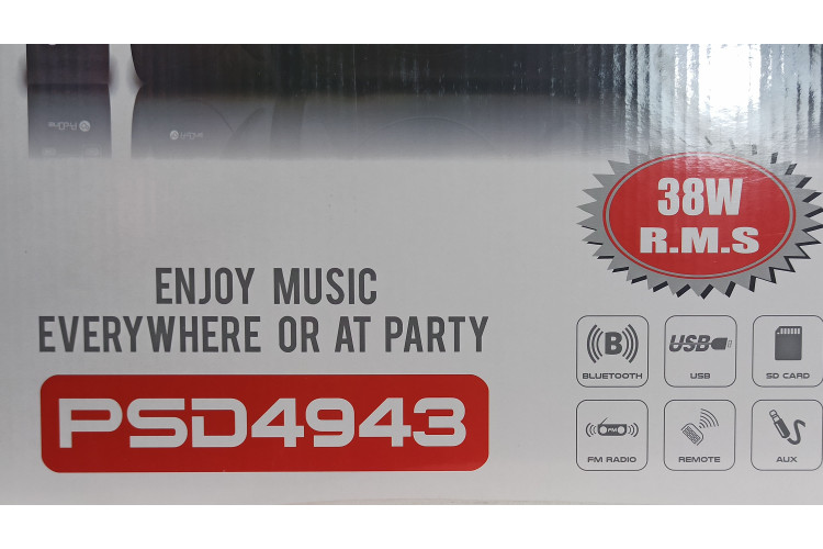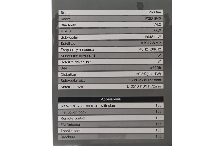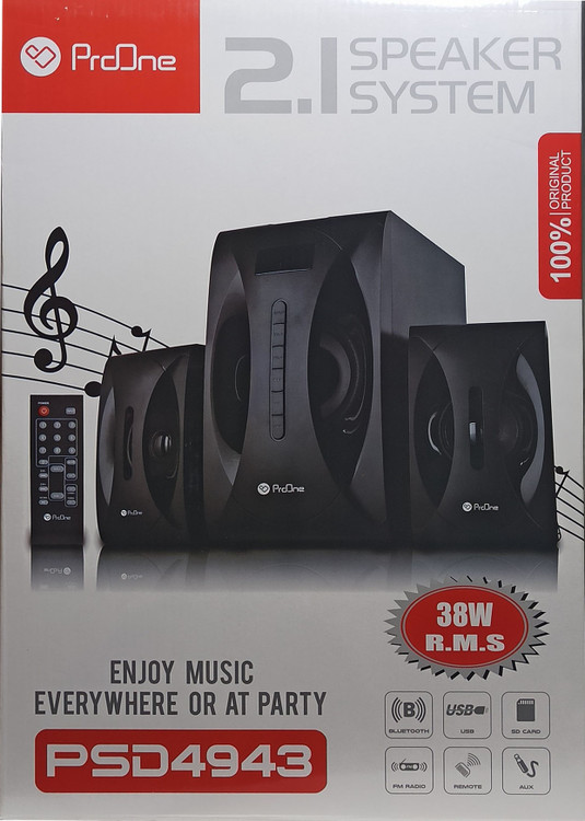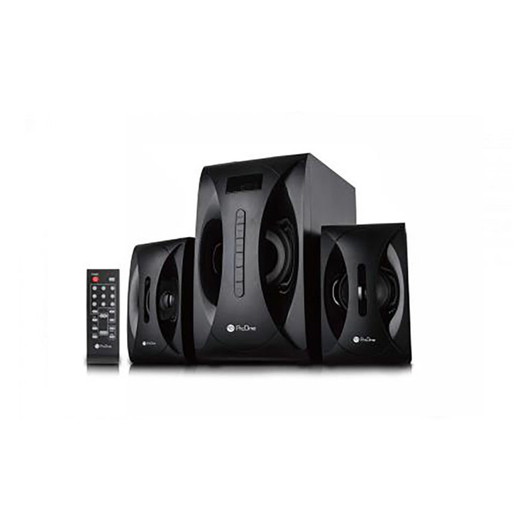 اسپیکر رومیزی ProOne PSD4943، یک اسپیکر دسکتاپ جمع و جور 6 کیلویی که با RF، AUX و یا بلوتوث به منبع صوت مثل گوشی هوشمند شما میتواند متصل شود. علاوه بر این یک پورت USB برای فلش و یک شیار حافظه برای MicroSD Ram دارد. علاوه بر دکمههای کنترل روی ساب ووفر، یک ریموت هم برای کنترل از راه دور در نظر گرفته شده است. به قیافه این محصول نمیخورد که محیط را به لرزه درآورد اما به لطف درایور ساب ووفر حدوداً ۱۳ سانتیمتری و خروجی صدای ۳۸ واتی، خب؛ انتظار دیگری هم نمیتوان از PSD4943 داشت! پوشش دامنه صوتی ۴۰ تا ۲۰ کیلوهرتزی، همان استانداردیست که هر اسپیکر با کیفیتی باید داشته باشد تا بتوانید BASSترین و Trebleترین صداها را به خوبی بشنوید و چیزی از کیفیت موزیک را از دست ندهید.